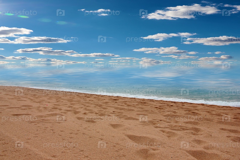 Красивый песчаный пляж и солнечное небо как место для активного отдыха