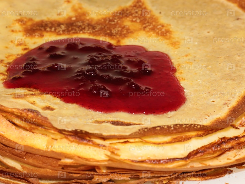 Красивый малиновый варенье течет над кучей красных блинов