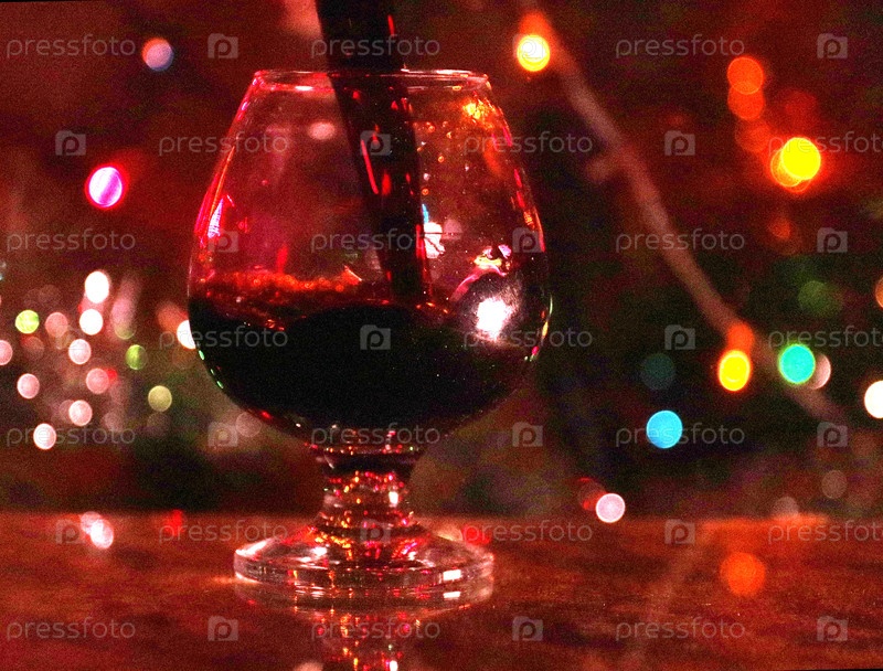 Струя красного вина, когда она наливается в стакан на праздничном фоне