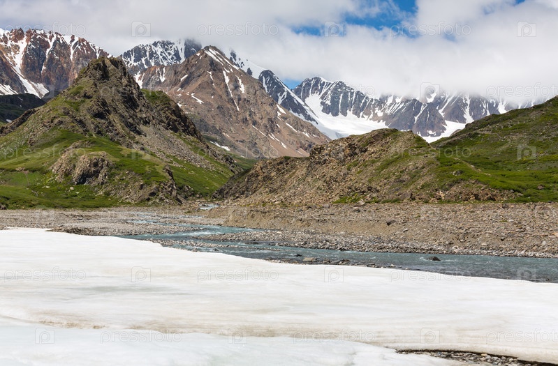 Пейзаж скалистой речной долины со снегом в пасмурный летний день на фоне зеленых склонов и заснеженного хребта Альтайских гор, Сибирь.Путешествие по высокогорным районам и исследование дикой природы