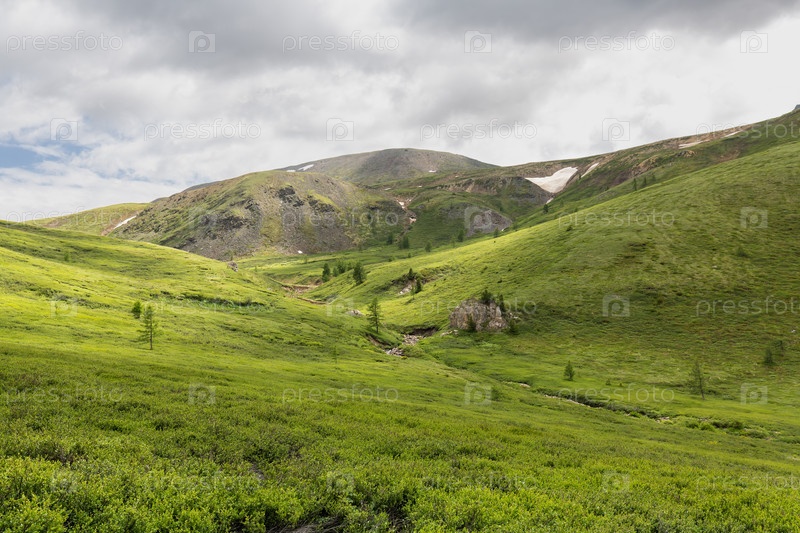 Панорамный вид на красивую зеленую обширную горную долину в пасмурный день в Алтае, Сибирь. Горные походы и путешествия, исследование дикой природы во время летних каникул
