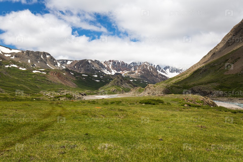Красивый пейзаж зеленоватой травянистой долины в пасмурный летний день на фоне заснеженного хребта Алтайских гор, Сибирь.Путешествие по высокогорным районам, походы и исследование дикой природы