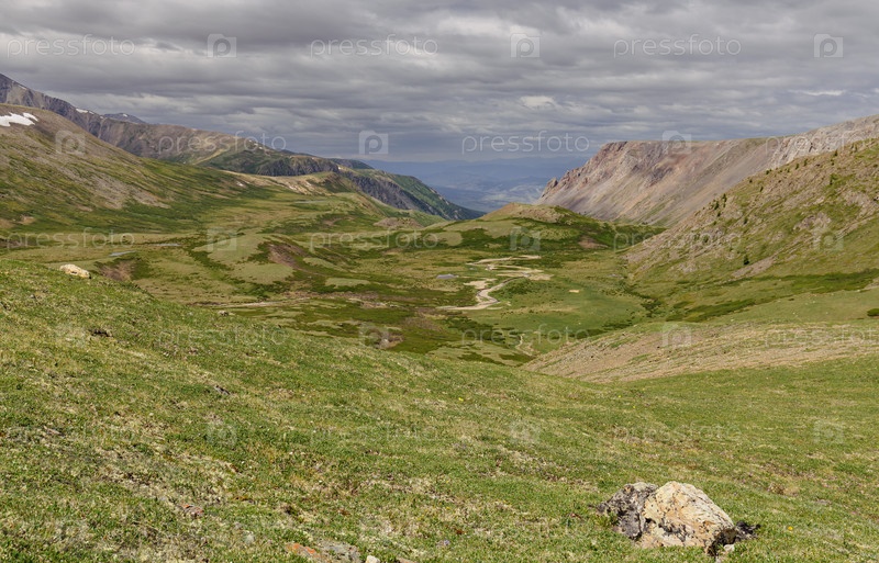Красивый пейзаж зеленоватой травянистой долины в пасмурный летний день