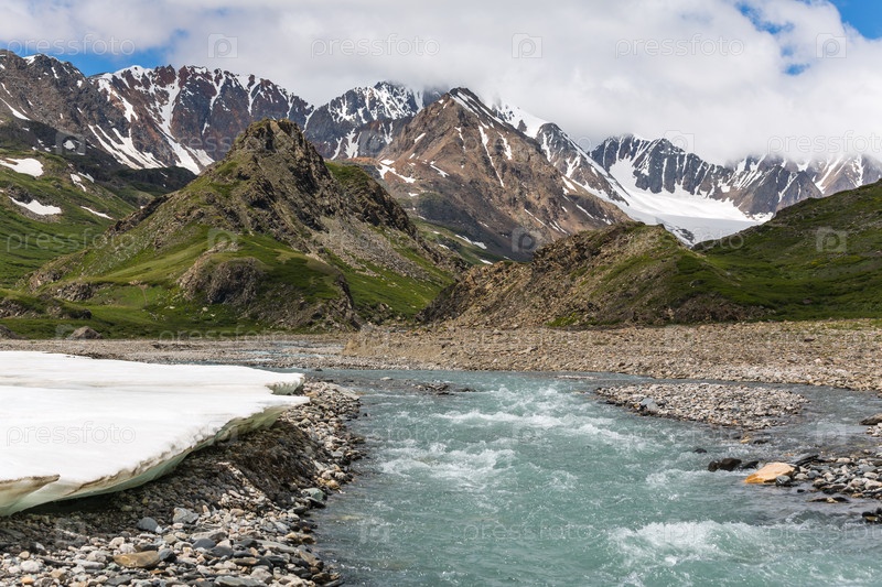 Живописный вид на чистую бирюзовую реку в горной долине в пасмурный день на фоне Алтайского хребта, Сибирь Летняя поездка по высокогорным районам, походы и исследование дикой природы