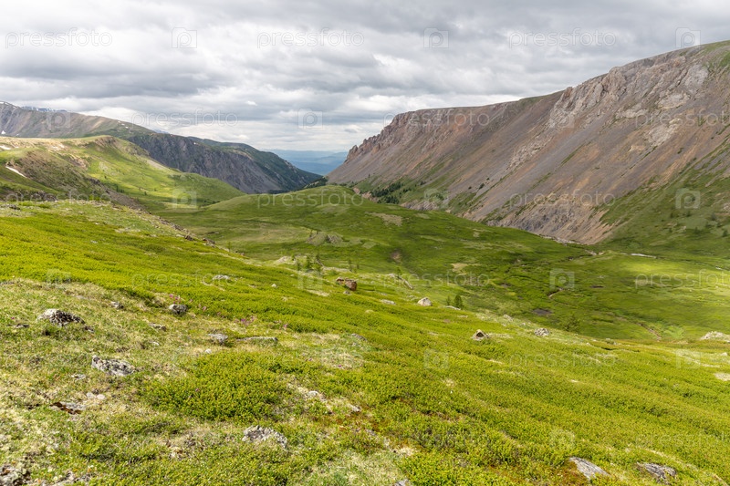 Панорамный вид на красивую зеленую долину в пасмурный день между двумя хребтами гор Алтая, Сибирь