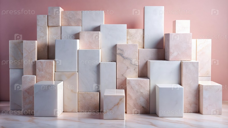 Белые мраморные каменные блоки художественно расположены на розовом фоне, демонстрируя геометрические формы в современном дисплее для эстетических целей