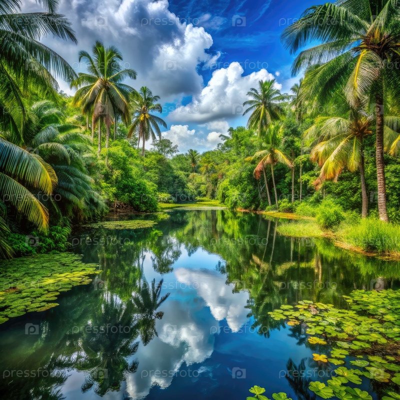 Роскошный тропический оазис с кристально чистой водой, окруженной пальмами и яркой зеленью