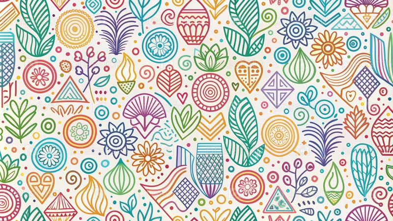 Ручно нарисованный рисунок с изображением природы и геометрических форм в ярких цветах
