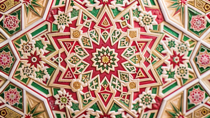 Близкий взгляд на традиционные исламские геометрические узоры со сложными рисунками в красном, зеленом и золотом цветах с исторического архитектурного объекта