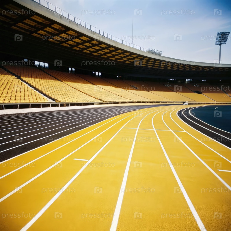 Беговая трасса на стадионе с пустыми желтыми сиденьями в солнечный день