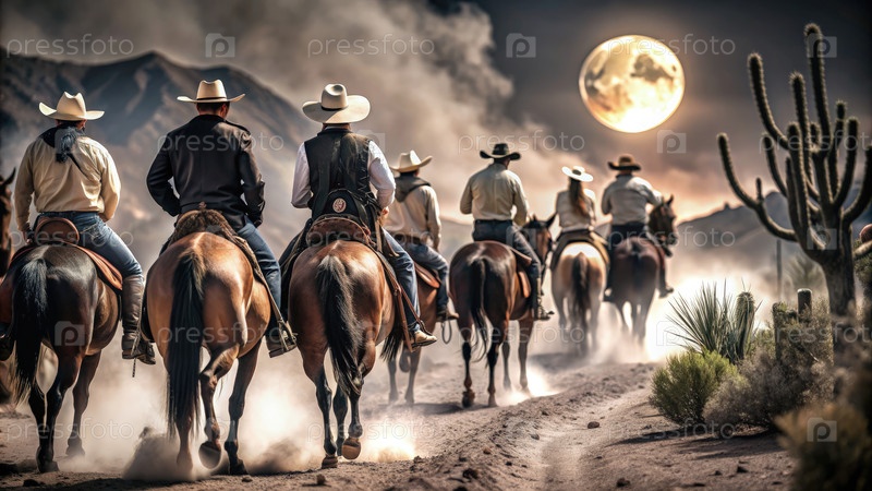 Ковбои, едущие на лошадях по пыльной дороге под полнолунием