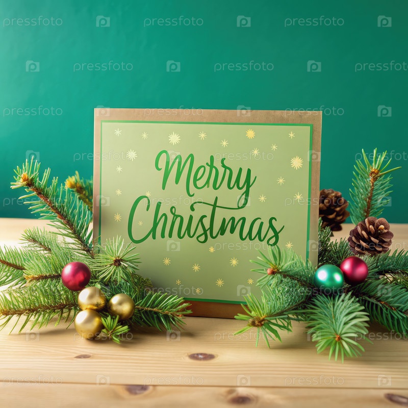 Рождественская открытка, выставленная на столе в окружении праздничной зелени и орнаментов