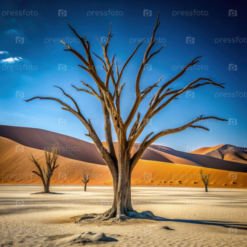 Одинокое мертвое дерево стоит на фоне песчаных дюн в обширной пустыне под чистым голубым небом