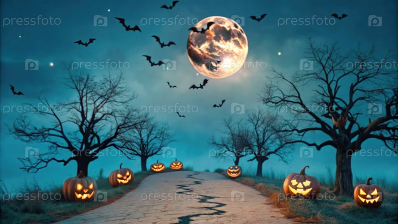 Потрясающе красивая ночь Хэллоуина с светящимися тыквами и летучими мышами, летающими под полнолунием