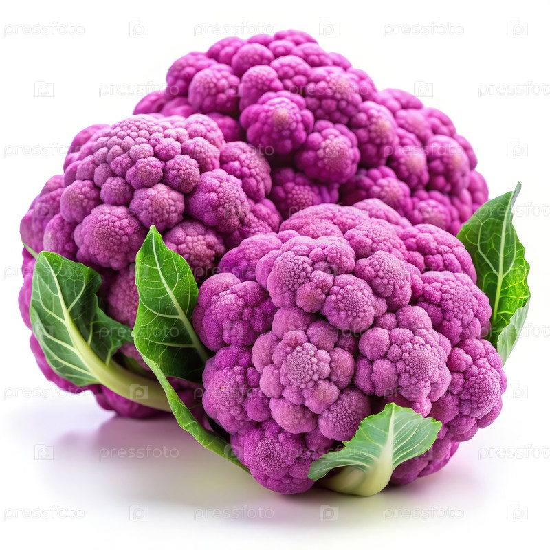 Свежие органические фиолетовые головки цветной капусты с зелеными листьями на белом фоне