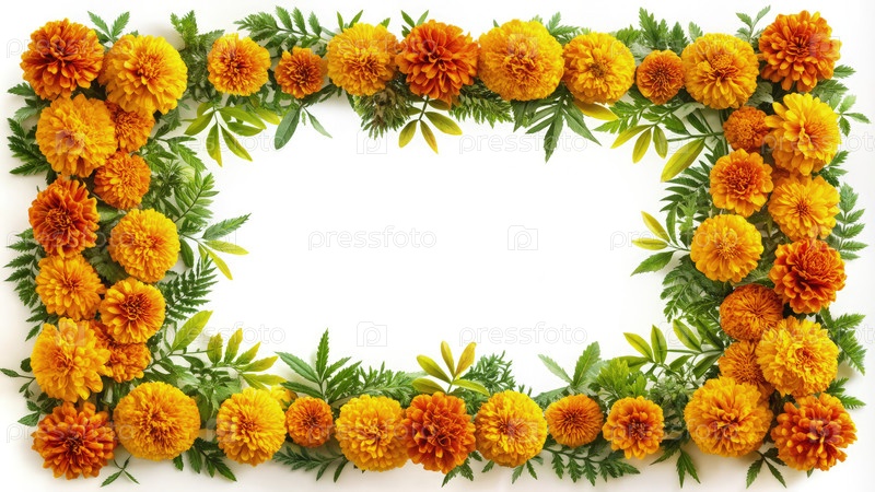 Декоративная рама, изготовленная целиком из цветов марихуаны в ярких оранжевых и желтых цветах, окружена пышной зеленой лиственницей, идеально подходит для праздничных торжеств
