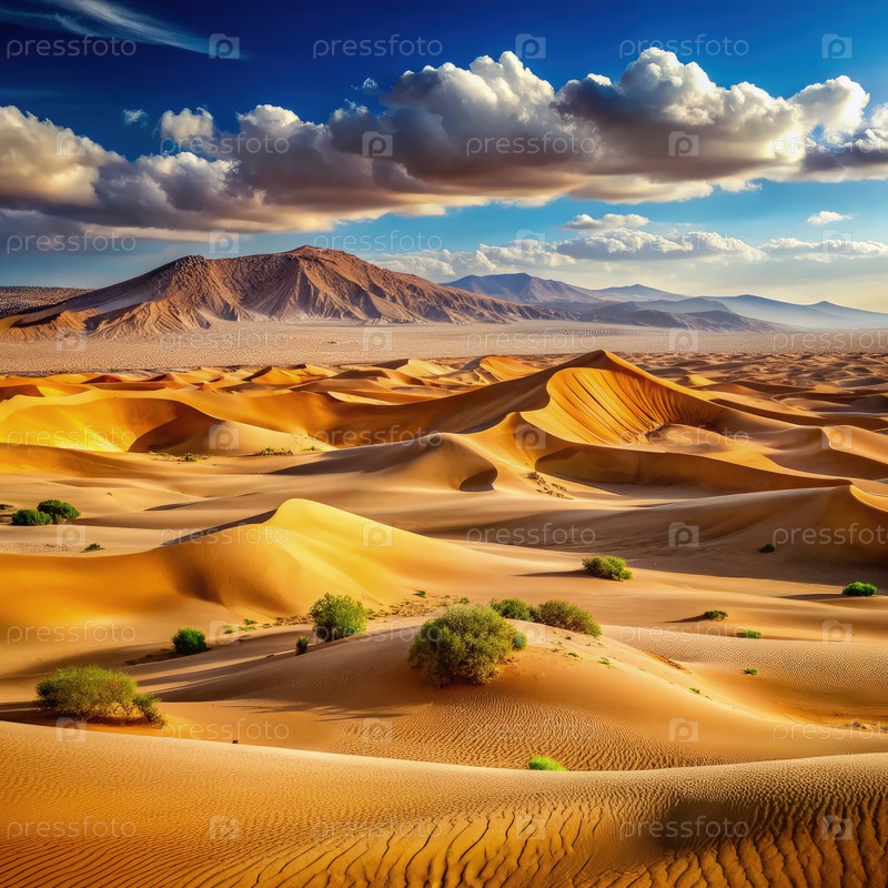 Пустынная долина, окруженная величественными песчаными дюнами в пустыне на закате