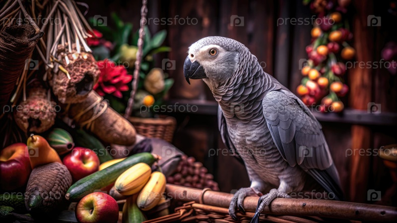 Африканский серый попугай сидит на стандартной шкале рядом со свежими продуктами на рынке