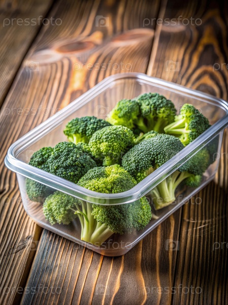 Свежий брокколи в прямоугольном прозрачном контейнере на деревянном столе
