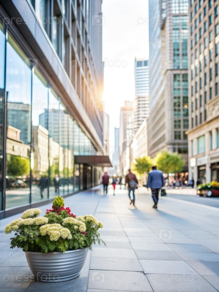 Пушистый тротуар делового квартала в солнечный день с пешеходами, проходящими мимо ярких цветочных плантаторов и высоких зданий города