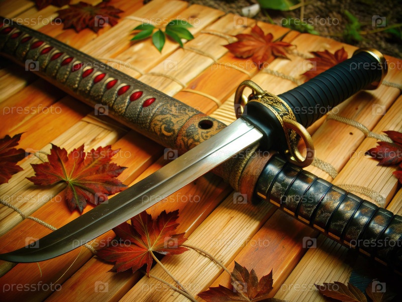 Традиционная катана, отдыхающая на постели осенних листьев с замысловатыми деталями