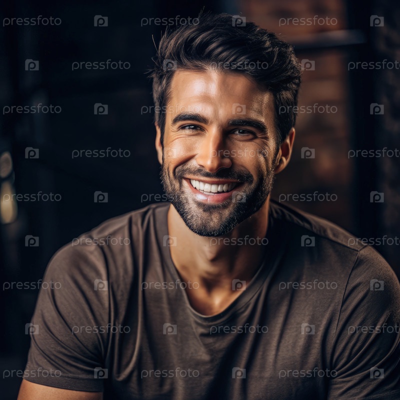 Красивый мужчина тепло улыбается, нося повседневную футболку в помещении