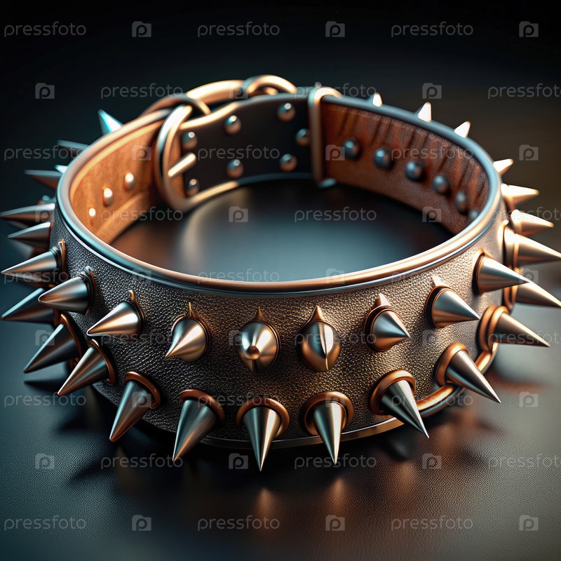 Детальный дизайн кожевенного ошейника с шипами, опирающегося на темную поверхность с заметными металлическими шипами и прочной запойкой