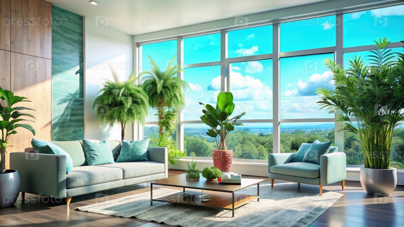 Яркая и прозрачная минималистическая гостиная с большими окнами и пышными растениями