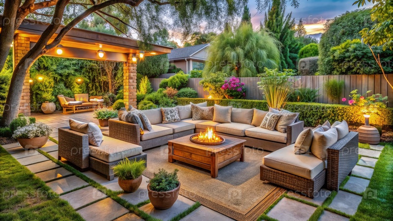 Уютный оазис на открытом воздухе с сиденьями и камином в тихом заднем дворе