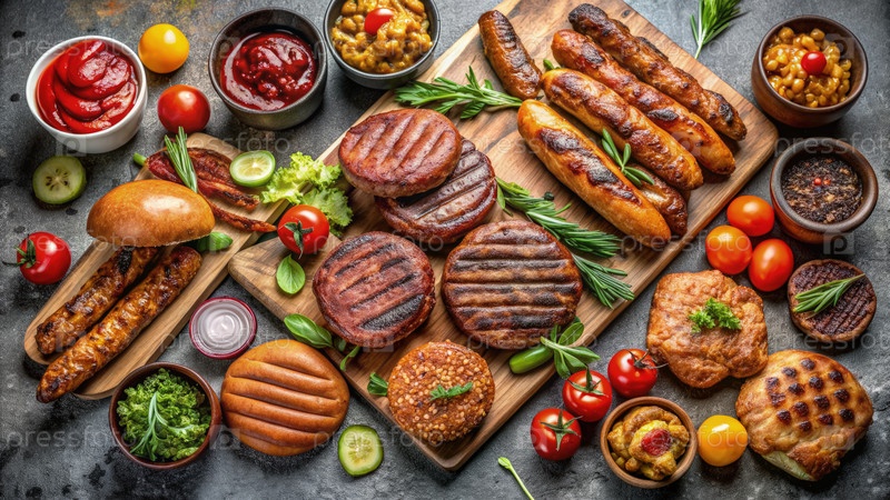 Вкусный ассортимент жареного мяса, гамбургеров и боковых блюд расположен на деревянной доске во время летнего собрания барбекю