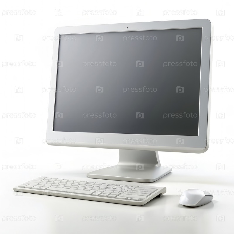 Передний вид изящного настольного компьютера с клавиатурой и мышью на белом фоне
