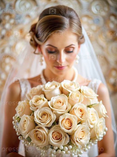 Элегантная невеста держит пышный букет розовых кремов, окруженных тонкими жемчужинами на романтической свадебной церемонии