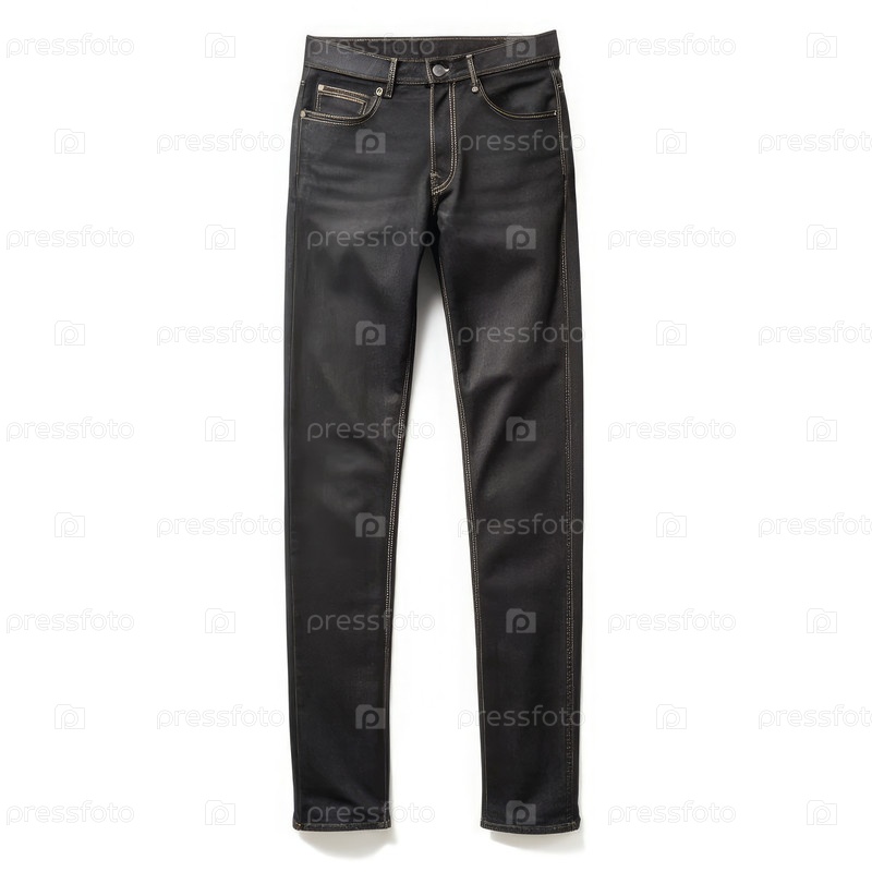 Пара стильных черных джинсов на чистом белом фоне, демонстрирующих современный дизайн и универсальную одежду для различных случаев