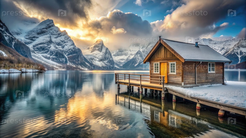 Спокойный деревянный дом у озера, окруженный величественными горами на закате