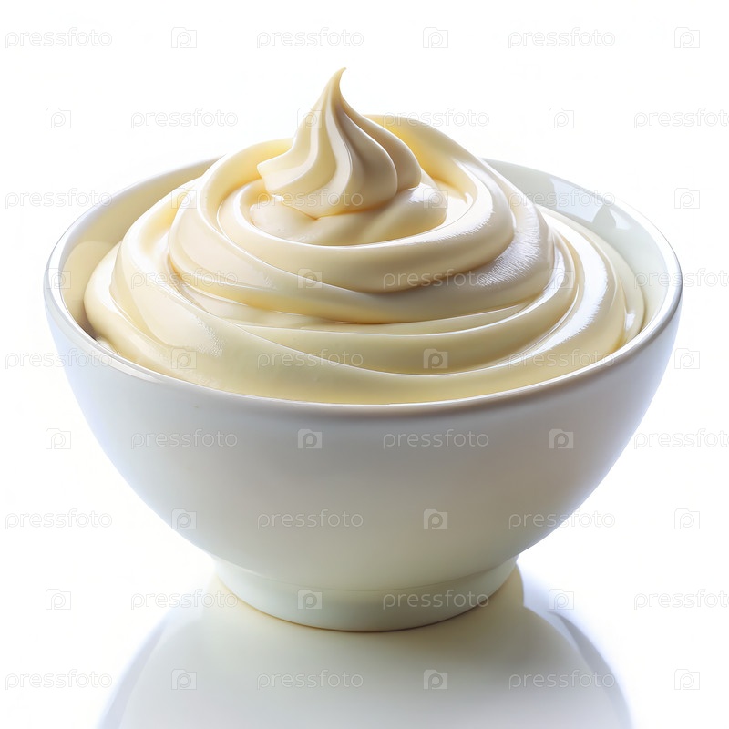 Кремный отбитый топинг в миске на белом фоне идеально подходит для десертов и выпечки