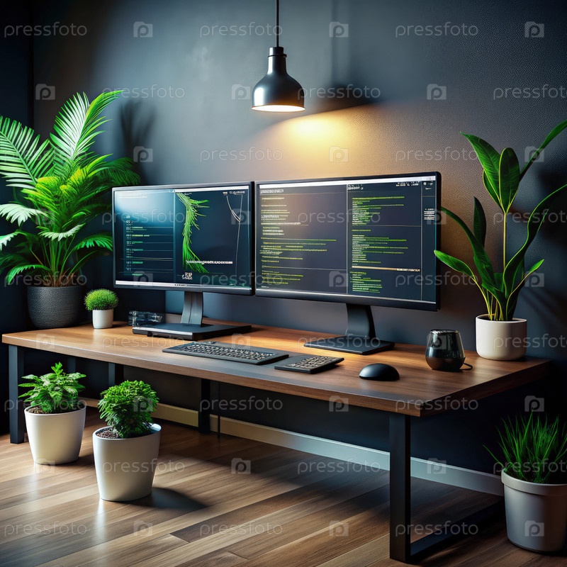 Современное рабочее пространство с двойными мониторами и зеленой средой для продуктивной атмосферы