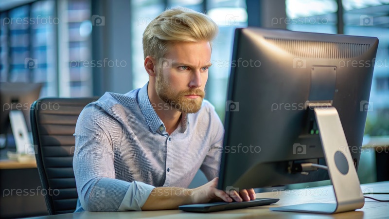 Красивый блондин, усердно работающий за компьютером в современной офисной среде днем