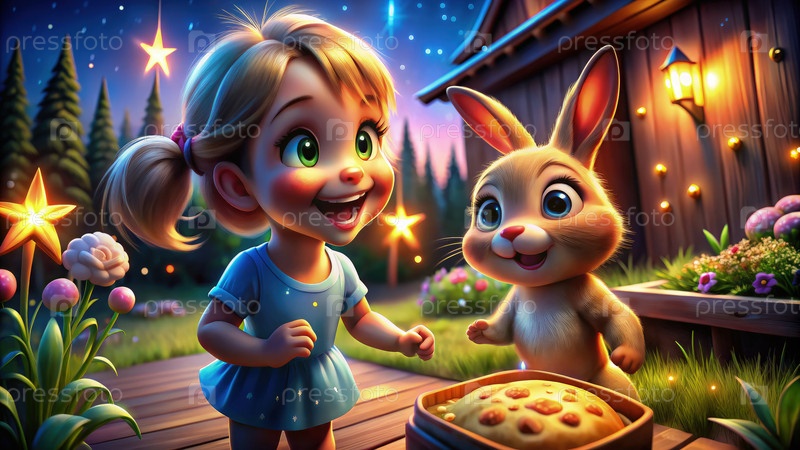 Веселая девушка танцует с дружелюбным кроликом под звездной ночью возле уютной деревянной хижины