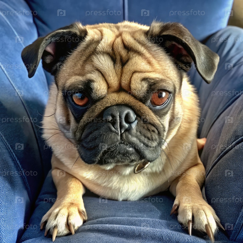 Злой муг, отдыхающий на синем кресле с серьезным выражением лица