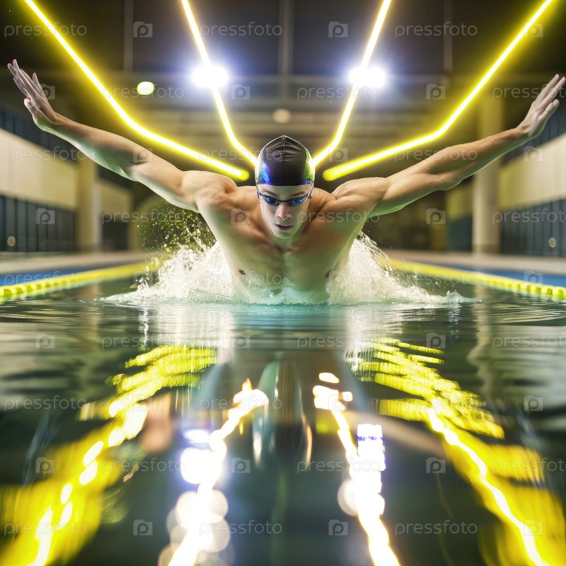 Плаватель выполняет мощный удар с распростертыми руками в ярко освещенном крытом бассейне во время соревнования ночью