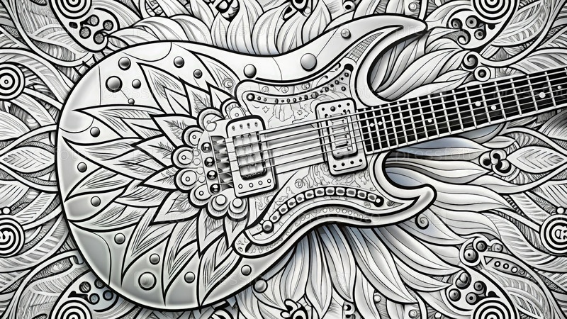 Контурный рисунок электрической гитары с декоративными цветочными узорами для окраски