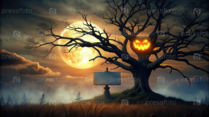 Силуэт жуткого дерева под полной луной с лицом тыквы на Хэллоуинском закате