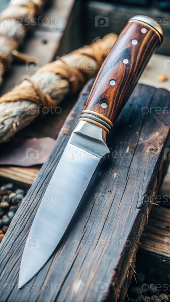 Детальное изготовление ножа на деревянной поверхности с рустическими элементами