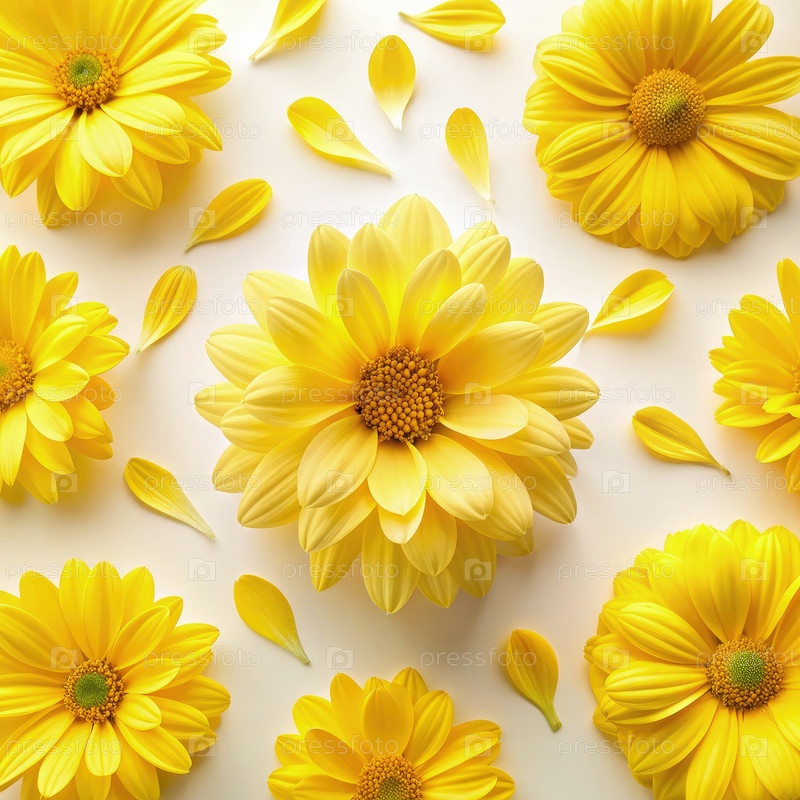 Ярко-желтые цветы и лепестки расположены на белом фоне