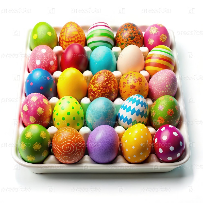 Красочные пасхальные яйца расположены на подносе с белым фоном