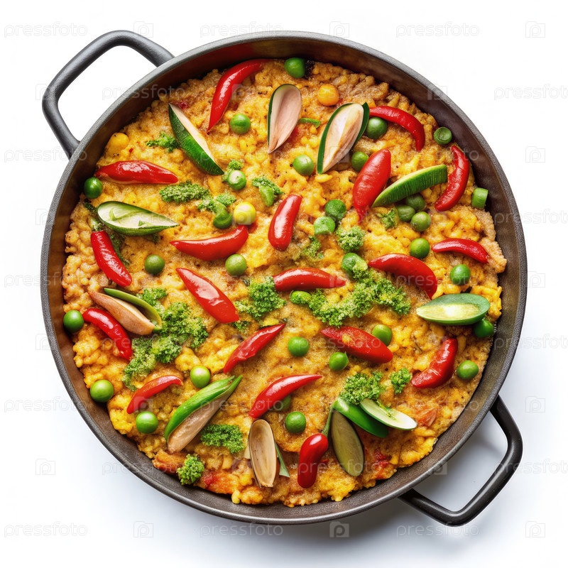 Яркий вид сверху растительной паэльи, украшенной красочными перцами, горохом и травами, готовыми к подаче на белом фоне