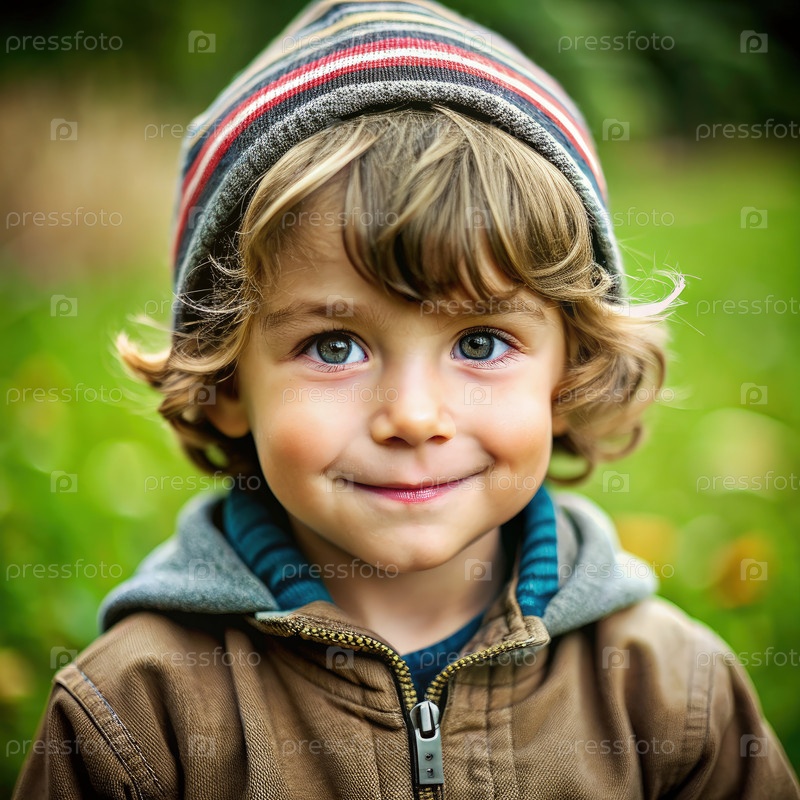 Улыбающийся мальчик носит полосатую шапочку в зеленом парке осенью