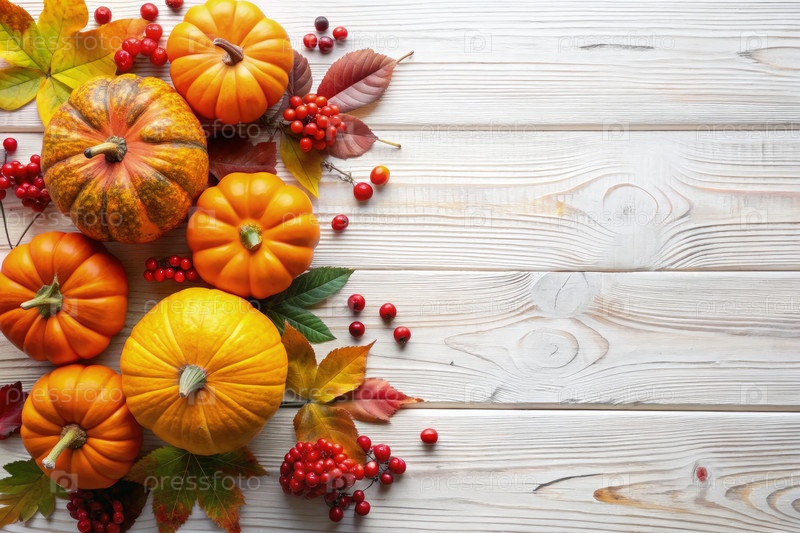 Праздничный осенний декор с изображением тыквен, ягод и листьев на деревянной поверхности