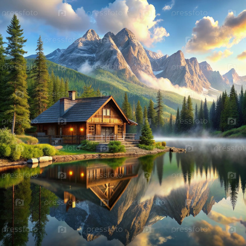 Спокойный горный отдых с хижиной у безмятежного озера при закате солнца
