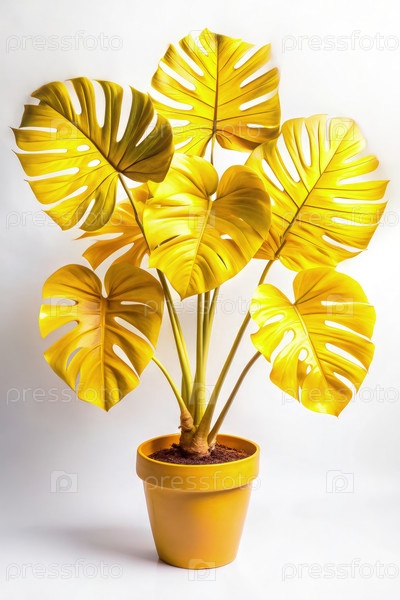 Ярко-желтые растения монстеры в терракотовом горшке на белом фоне